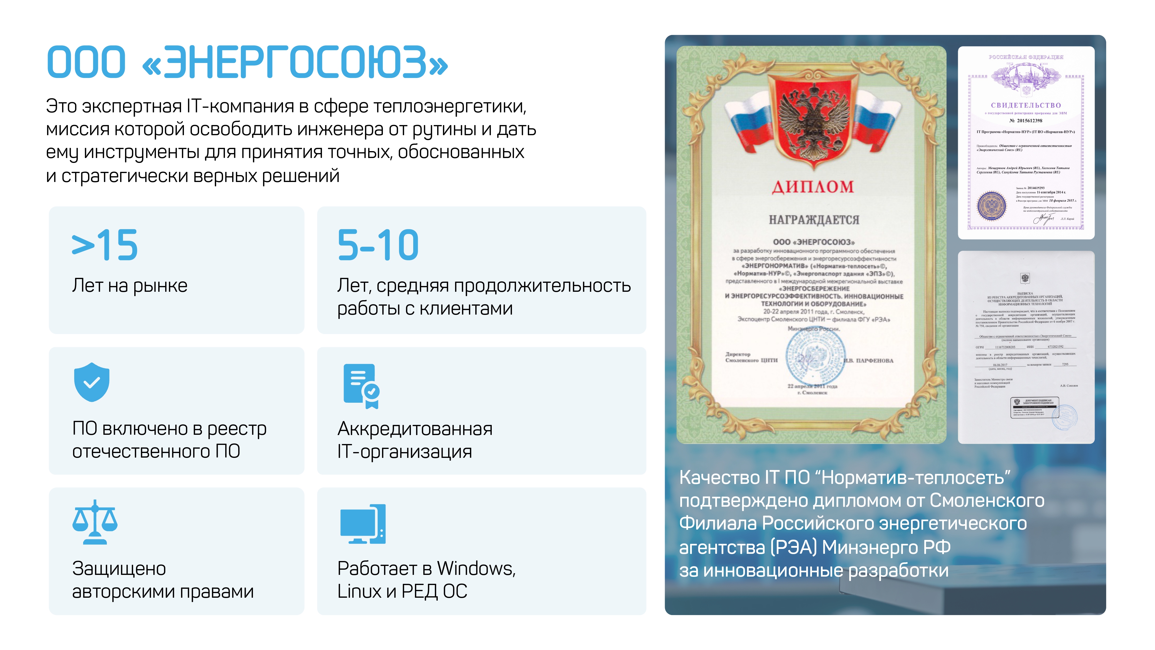 Компьютерная программа IT ПО «Норматив-теплосеть. Эксперт»- Это, в первую очередь, программа для расчета нормативов (при нормативных или фактических температурах наружного воздуха и температуры теплоносителя) тепловых потерь в тепловых сетях - ключевого показателя энергоэффективности. Получить результаты расчетов технологических потерь при передаче тепловой энергии за 1 минуту – так работаем мы и наши клиенты уже более 6 лет. Когда все исходные данные под рукой – больше времени не нужно, ведь есть компьютерная программа IT ПО «Норматив-теплосеть. Эксперт»!